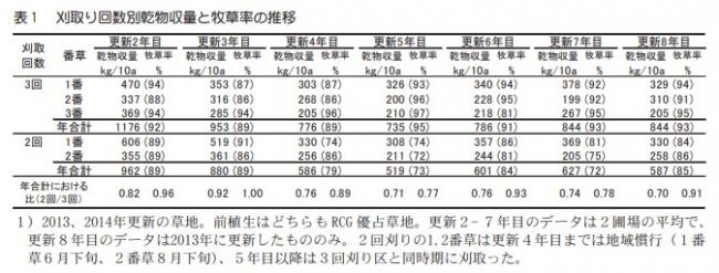 2)台地土では OG、PR 混播草地(OP50)の年間3回刈の草種構成は、8年目まで一貫して良好であった。2回刈りでは3回刈りと比較し、年合計乾物収量が7割程度、牧草率が8割程度に低下した(表1)。OG、PR 混播では年3回刈りが望ましい。刈取り時期は1番草は OG の出穂始~出穂期、再生草は生育日数40-50日とする。