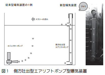 1)エアリフトポンプ型曝気装置は、内径30cm の塩ビ製直立管で管路底部から空気を送り込み、管路内での強攪拌により曝気効果を得る(図1)。低水分・高粘度スラリーへの適合性が高く、大量加水や固液分離処理が不要である。夾雑物による管路閉塞も生じない。吐出口を液面に設置することで液面上の泡に対して消泡効果が生じ、消泡装置や消泡材が不要である。