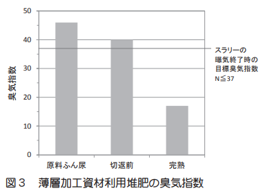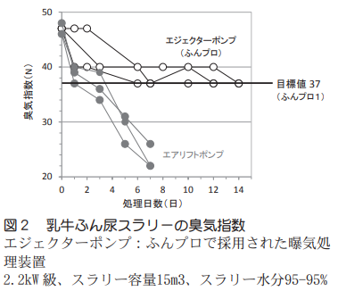 2)乳牛ふん尿スラリー(容量100㎥ / 約1000頭分 / 種汚泥なし)における曝気処理では、処理3日目で臭気指数が目標とする37以下まで低下した。さらに曝気処理することで臭気指数は30以下まで低下し、ふん尿臭はなくなった(図2)。