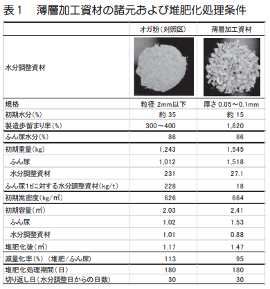 4)堆肥化処理では、乳牛ふん尿1t に対して資材使用量17.8kg で完熟堆肥(180日後)となり、臭気指数は17まで低減した。オガ粉の1/10以下の使用量に低減できる(表1、図3)。