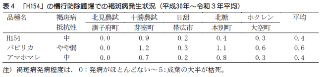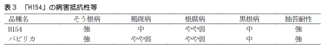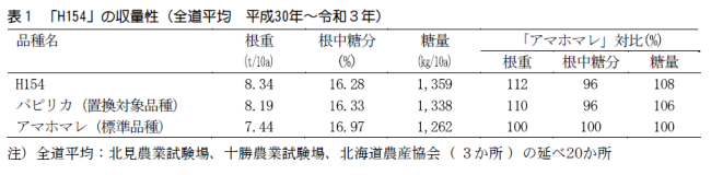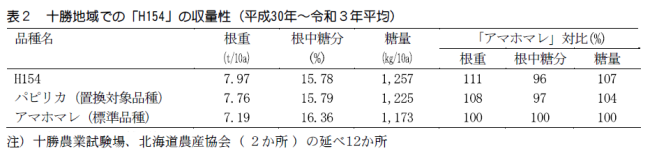 1)収量性 研究機関で行われた全道平均を表1に示す。「H154」の根重、根中糖分、糖量はほぼ「パピリカ」並である。十勝地域では、「H154」は「パピリカ」よりやや収量性が高かった(表2)。