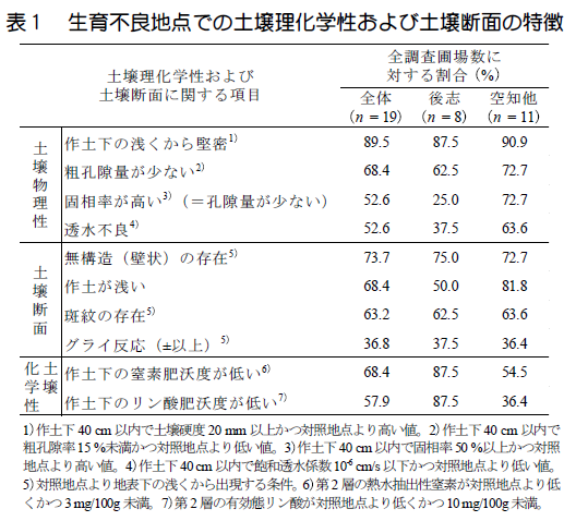 1)生育不良地点は対照地点に比べて作土が浅く、作土下の浅くから堅密で亀裂や孔隙が少なく窒素やリン酸肥沃度の低い土壌環境であることが推察された( 表1)。生育不良地点では作土が流された傾斜上部や圃場造成時の切土部など、土壌理化学性の不良な母材が作土下の浅い位置から出現していると考えられた。