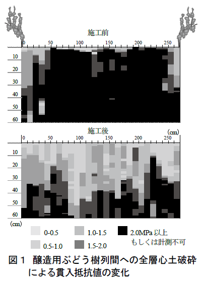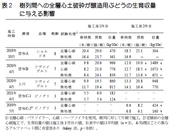 3)醸造用ぶどうの定植前ならびに定植後、列間への全層心土破砕により施工深度(深さ40cm)までの土壌が全体的に膨軟になり土壌の浸透能が高まり、土壌物理性や施工後の土壌水分環境も改善し、施工後における醸造用ぶどうの生育収量は概ね良好な傾向を示した(図1、表2)。ぶどう樹列の両側に施工した場合、片側のみの施工や無処理区に比べて生育収量が劣った(データ略)。