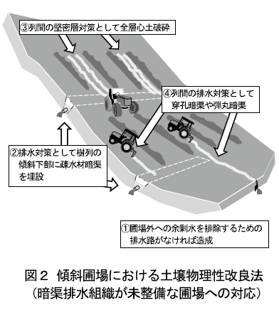 7)以上の結果を元に、ぶどう樹列の傾斜下部端に集水用の疎水材暗渠を列に交差する方向に埋設し、列間に施工する改良機の破砕刃を暗渠疎水材や排水路に接続させる土壌物理性改良法を示した(図2)。