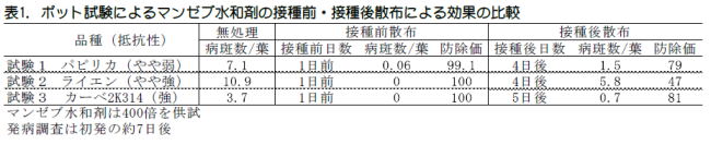 1)マンゼブ水和剤は、接種後散布では防除効果が劣るが、接種前に散布すると高い防除効果が得られた(表1)。本剤に浸透移行性がなく、感染後の防除効果は得られないため、予防効果の持続期間内に次の散布を行う必要がある。