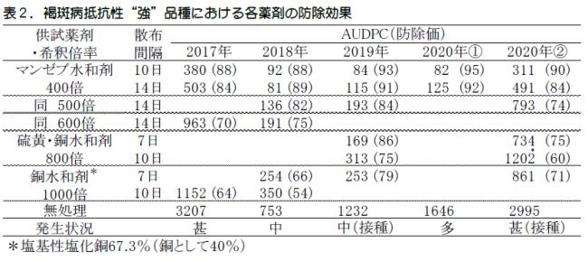 3)本成績はマンゼブ水和剤以上の効果を有する別系統薬剤が登録されるまでの当面の対策とする。