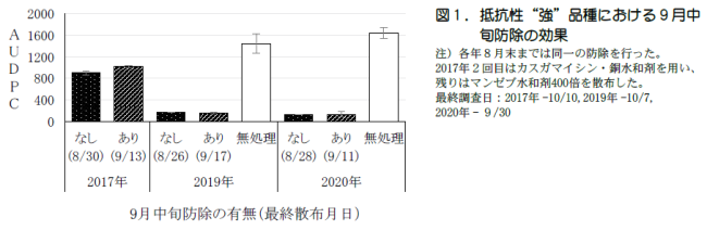 抵抗性“強”の品種では、次の防除法により省力的かつ高い防除効果が得られる。初発後までにマンゼブ水和剤400~500倍の散布を開始し、その後は14日間隔で8月6半旬~9月1半旬まで散布を継続し、9月2半旬まで予防効果を維持する。なお、多発条件下では400倍の防除効果が高い。