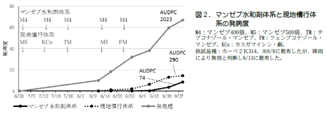 2)マンゼブ水和剤の400~500倍の14日間隔散布と10日間隔散布の防除効果を、AUDPC で評価したところ、ほぼ同等であることが示された。このことから本剤の予防効果は14日程度持続すると考えられた。