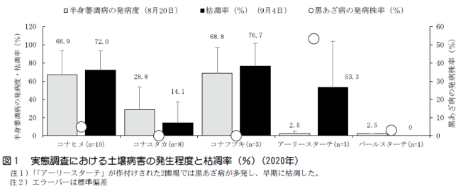 1)3カ年で63圃場の実態調査をしたところ9月下旬まで枯凋期に達しない圃場があるなか、20圃場で8月下旬~9月初旬に60%以上の枯凋率となり、早期枯凋症状が確認された。それらの圃場では半身萎凋病の発生程度が高く、早期枯凋症状の主な要因であった(図1)。また、2020年の2圃場(「アーリースターチ」作付圃場)では黒あざ病の多発生による早期枯凋症状が確認された(図1)。