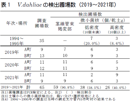 3)ほとんどの圃場から微小菌核が検出され、高密度(10個/ 乾土g 以上)圃場も4割認められ、1994~1995年の調査時より検出割合が3倍以上に増加し、半身萎凋病の発生が拡大していた(表1)。また、半身萎凋症状を呈する個体からはVerticillium 属菌が分離され、その優占菌種はV.dahliae であった(データ省略)。