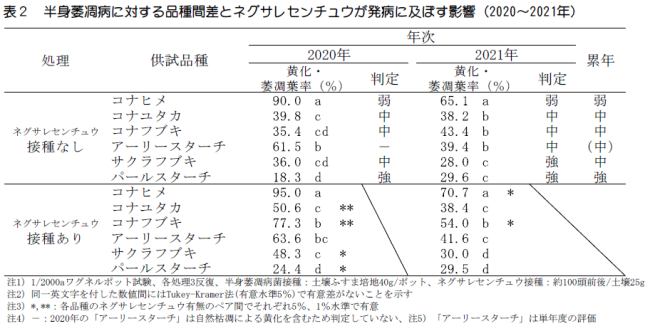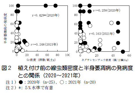 4)2020年において植え付け前のGr 密度と半身萎凋病の発生程度には正の相関関係が認められたが、ネグサレセンチュウについては両年とも一定の傾向は認められなかった(図2)。Gr およびネグサレセンチュウが半身萎凋病に及ぼす影響をポット試験により検討した結果、線虫類が半身萎凋病の発病を助長する場合があったが、助長の有無は年次間や品種間で異なった。一方、半身萎凋病の発病程度は品種間で明らかに異なった(表2)。これらのことから、半身萎凋病に与える影響は線虫類よりも品種の方が大きいと考えられた。
