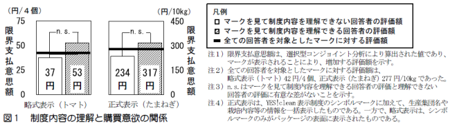 1)マークを見てYES ! clean の制度内容を理解できる消費者は、道産食品登録制度より少なく、正式表示よりも略式表示で少なかった。消費者はマークの制度内容について、略式表示では「わからない」と認識しているのに対し、正式表示では「化学肥料」や「農薬」等と認識していた。マークの表示により、生産地の理解や購買意欲の向上については一定の効果が認められた。マークを見て制度内容を理解できるとした消費者の評価はばらつきが大きく、制度内容の理解と購買意欲との関係は判然としなかった(図1)。以上から、マークの課題は消費者に制度内容が伝わりにくい点であり、これを補完するための説明文が必要とされる。