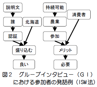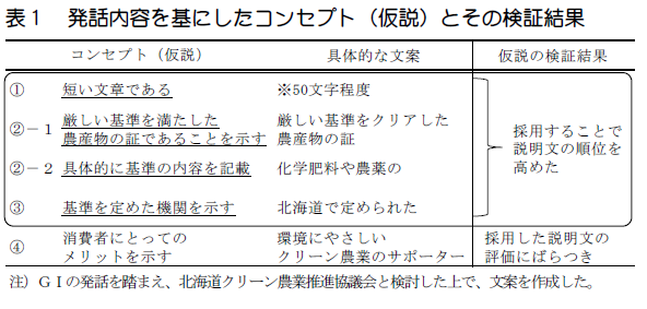 2)現状のYES ! clean 表示制度の説明文で魅力に感じる点としては、「厳しい」「基準」を「満たす」「農産物」の「証」であることが挙げられた。説明文の改善点としては、文章が長いため「一行」程度の短い文とする要望が挙げられた。特に、説明文に加えるべき点として、「認証」している主体や「メリット」を示すことが必要との意見が挙げられた(図2)。以上を踏まえ、説明文に必要となるコンセプトを、表1のとおり設定した。