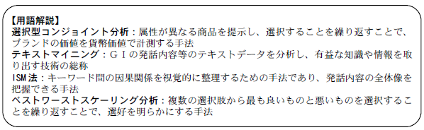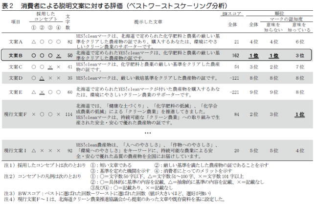 複数の説明文案に対する消費者の選好をベストワーストスケーリング分析により相対評価した。また、自由記載欄に記されたキーワードの出現頻度や肯定的及び否定的な意見に固有なキーワードを明らかにした。