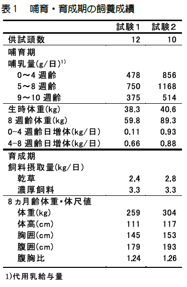 以上により、哺育期の代用乳は最大1,200g/ 日まで給与、育成期濃厚飼料は4kg/ 日を上限とし、11ヵ月齢から濃厚飼料を増給し、肥育中期以降は飽食給与により、26ヵ月齢出荷で慣行肥育と同等の枝肉成績が期待できる。