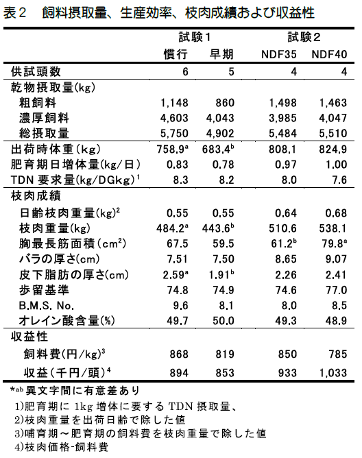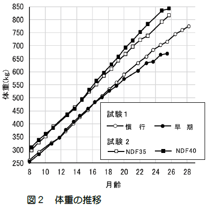 2)試験2:哺乳量増量により子牛の0- 4週齢日増体は0.93kg/ 日となり、試験1の供試牛と比べ初期発育が改善された(表1)。8ヵ月齢の体重は304kg となり、試験1の供試牛より高かった。11ヵ月齢から濃厚飼料を増給し、両区とも19ヵ月齢で飽食量となったが、NDF40区は24ヵ月齢まで11kg/ 日以上で推移した(図1)。NDF40区は24ヵ月齢で体重が800kg を超え、日増体は1.00kg/ 日となった(図2、表3)。26ヵ月齢出荷体重はNDF35区で808.1kg、NDF40区で824.9kg となった。NDF40区は枝肉重量が538.1kg、胸最長筋面積が79.8cm 2、ばらの厚さが9.07cm、歩留基準値が77.0と高かった(表4)。NDF40区は1kg増体に対するTDN 要求量が7.6kg と少なかった。NDF40区はNDF35区より枝肉重量1kg に対する飼料費が低く、収益性も高かった。