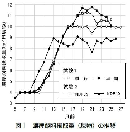 2)試験2:ほ乳量増量による哺育期発育向上効果を明らかにするため、供試牛は哺育期に代用乳を最大1200g/ 日まで給与した。育成期の濃厚飼料給与量は最大4kg とした。肥育前期は高NDF による肥育期増体効果を明らかにするため、NDF35区とNDF 区40区を設定し、乾草とアルファルファでNDF 含量を調整した。また、肥育中期以降の粗飼料は乾草を給与した。両区とも11ヵ月齢から濃厚飼料を飽食となるまで増給し、26ヵ月齢で出荷した。