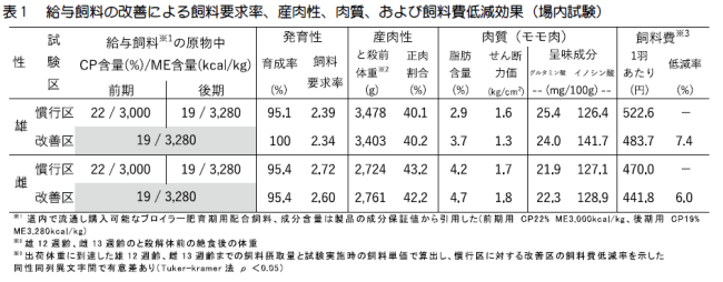 2)場内群では、改善区の発育性、産肉性、および肉質は慣行区と同等で、飼料費は慣行区より6.7%(雄7.4%、雌6.0%)低減し(表1)、現地実証群の飼料購入費は改善区が慣行区より3.9% 低減した。