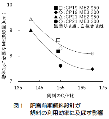 1)肥育前期ではME の利用効率が最も高いC/P 比は170程度と推定され(図1)、肥育後期ではME 摂取量の増加に伴い増体量が増加した。これらのことから、肥育前期飼料のME 含量とC/P 比を高め、肥育全期間で飼料中CP18~19%、ME3,200kcal/kg 程度が適当である。