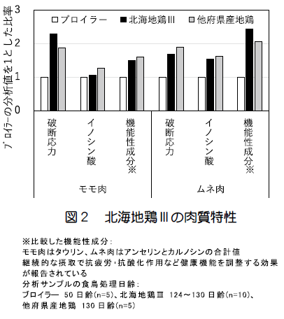 4)餌付けの早期多回給与は肥育開始28日齢における標準体重以下の雛割合を慣行区よりも低減させ、4月ふ化では増体量を有意に増加させたことから、発育改善に有効と考えられる(表2)。5)北海地鶏IIIの食味の歯ごたえやうま味の強さに関連する破断応力値やイノシン酸含量、および機能性成分含量はブロイラーより優れ、他府県産地鶏と同等である(図2)。試作した加工品のコンフィと鶏めしは、北海地鶏IIIの食味特性を反映しており、新たな利用法の提案に活用できる。