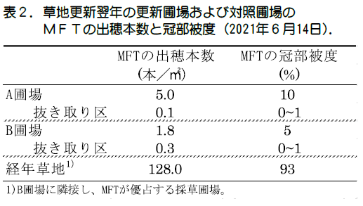 1)草地更新翌年(2021年)のMFT 出穂本数は、前植生の早刈りとライムギ2回刈りの草地更新体系を行った2圃場の方が経年草地よりも大幅に少なくなりました(表2)。この体系では、MFT を完全に排除することは困難ですが、除草剤を用いないMFT 防除技術として有望であると考えらました。