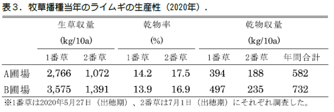 3)ライムギ2回刈りは1、2番草合わせて582~732kg/10a 程度の乾物収量が確認されたことから、牧草播種当年の粗飼料不足対策になると考えられました(表3)。