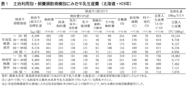 1)草地型酪農経営は大規模ほど経産牛1頭当たり濃厚飼料給与量が多いため、経産牛(以下、省略)1頭当たり全算入生産費が増加し、実搾乳量(以下、省略)100kg 当たり全算入生産費は経産牛50~79頭層を底に横ばいになる。畑地型酪農経営の1頭当たり全算入生産費は経産牛80~99頭層まで低下するが、経産牛100頭以上層はとうもろこしサイレージ給与比率が少ない下で経産牛1頭当たり実搾乳量(以下、個体乳量)が低いため100kg 当たり全算入生産費は高くなる(表1)。経産牛100頭以上層で、かつ成牛換算1頭当たり耕地面積が50a を下回る階層は濃厚飼料多給で個体乳量を高めているが、100kg 当たり全算入生産費が高まるため、1頭当たり耕地面積の確保は重要である(図表略)。