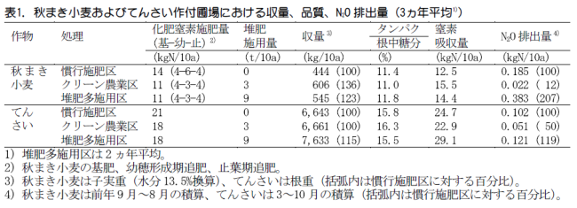 秋まき小麦-てんさいの作付けパターンは窒素投入量が多いタイミングであり、温室効果ガス(GHG)の一つである一酸化二窒素(N2O)の排出を促進する恐れがある。クリーン農業技術である適切な堆肥施用を活用した窒素減肥はN2O の排出抑制が期待できる。また、クリーン農業による堆肥施用が二酸化炭素(CO2)やメタン(CH4)を含むGHG 排出の全体量に及ぼす影響は明らかではなく、適切な肥培管理による温室効果ガスの排出抑制効果の提示が求められている。