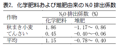 2)いずれの作付でも堆肥由来のN2O 排出係数(化学肥料由来の窒素施肥量あるいは堆肥由来の窒素施用量あたりのN2O 排出量の割合)は化学肥料由来より低かった(表2)。