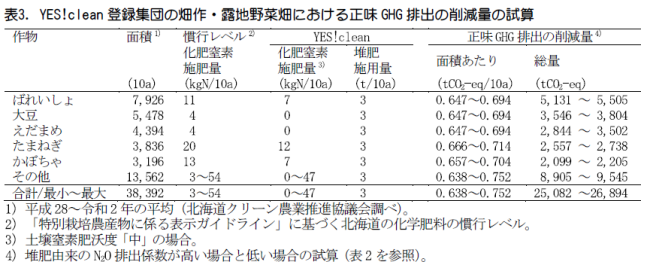 5)YES ! clean の登録集団の畑作・露地野菜畑において堆肥3 t/10a の施用と窒素減肥を導入した場合、堆肥を施用せず慣行レベルの窒素施肥を行った場合と比べて、正味GHG 排出量は面積あたりで年間0.64~0.75 tCO2-eq/10a 減、総量で年間2.5~2.7万tCO2-eq 減と試算された(H28~R 2年の平均、表3)。