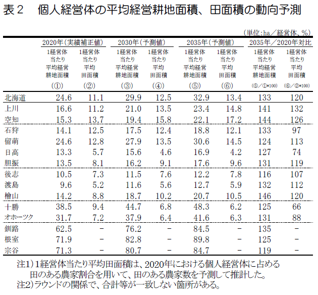 5)経営体当たりの平均田面積および平均乳牛飼養頭数は、2035年には13.4ha(2020年比120%)、116頭(2020年比108%)になると予測された(表2、平均乳牛飼養頭数はデータ略)。