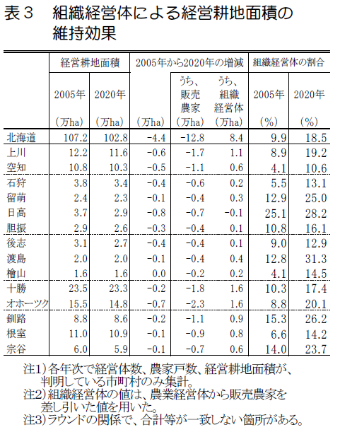 6)北海道における組織経営体と販売農家による経営耕地面積は、2005年から2020年で107.2万haから102.8万ha(-4.1%)に減少した(表3)。販売農家の経営耕地面積は、同期間に12.8万ha減少したが、組織経営体の経営耕地面積は8.4万ha拡大したことから、両者を合わせた農業経営体の経営耕地面積の減少は4.4万haにとどまる。また、組織経営体の経営耕地面積が占める割合は、9.9%から18.5%へと高まっている。このように、組織経営体は、農地の受け手として重要な役割を果たしていることから、地域の営農実態に応じて設立、育成を図る必要がある。