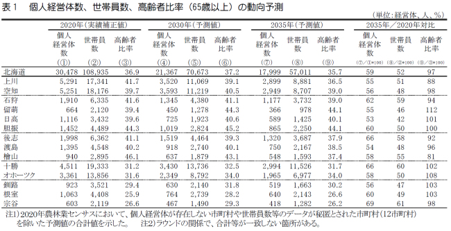 表1 個人経営体数、世帯員数、高齢者比率(65歳以上)の動向予測