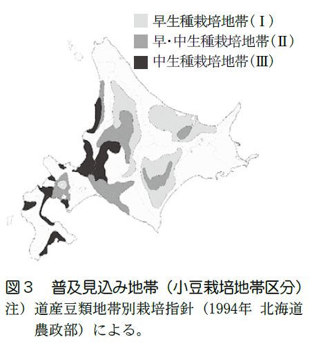 1)普及見込み地帯:全道の小豆栽培地帯のうち、早生種栽培地帯(Ⅰ)、早・中生種栽培地帯(Ⅱ)、中生種栽培地帯(Ⅲ)及びこれに準ずる地帯(図3)。