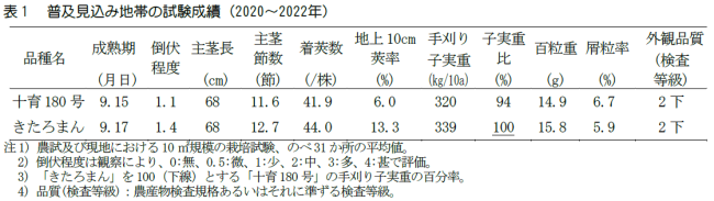 「十育180号」は、胚軸長が対照品種「きたろまん」の4.1cmに対して、9.0cmと長く(十勝農試、2020~2022年に調査した平均値)、地上10cm莢率5)が低いことから、ダイレクト収穫でロスが安定して少ない(表1、図1)。普及見込み地帯における手刈り子実重は「きたろまん」よりやや少ないものの、実規模栽培試験のダイレクト収穫において収量は多い(表1、図2)。成熟期は「きたろまん」と同等のやや早である。倒伏程度は同等である。百粒重は「きたろまん」よりやや軽いが、普通小豆の範疇である。外観品質は同等である(表1)。土壌病害の落葉病菌レース1、茎疫病菌レース1,3,4、萎凋病菌に対して抵抗性を持つ。低温抵抗性は中であり、道内で安定して栽培可能なレベルである(表2)。実需者による製品試作試験における評価は「きたろまん」と同等であり、北海道産小豆として十分使用可能な加工適性を有する(表3)。