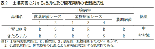 (2)土壌病害の落葉病、茎疫病、萎凋病に抵抗性を持つが、栽培に当たっては適正な輪作を守る。