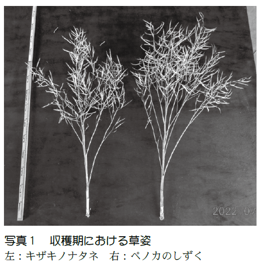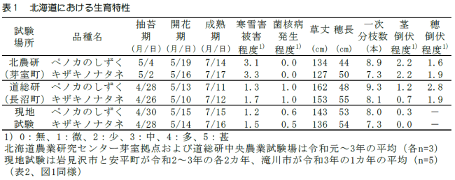 1)抽苔期・開花期は「キザキノナタネ」より数日遅く、成熟期は「キザキノナタネ」より数日早い。春播き抽苔性は「キザキノナタネ」より弱く、春播きには適さない。寒雪害抵抗性や菌核病発生程度は「キザキノナタネ」と同程度である。