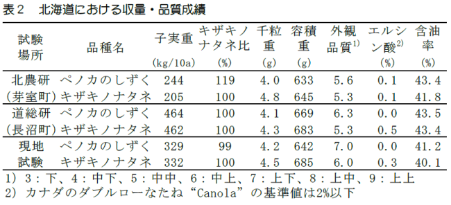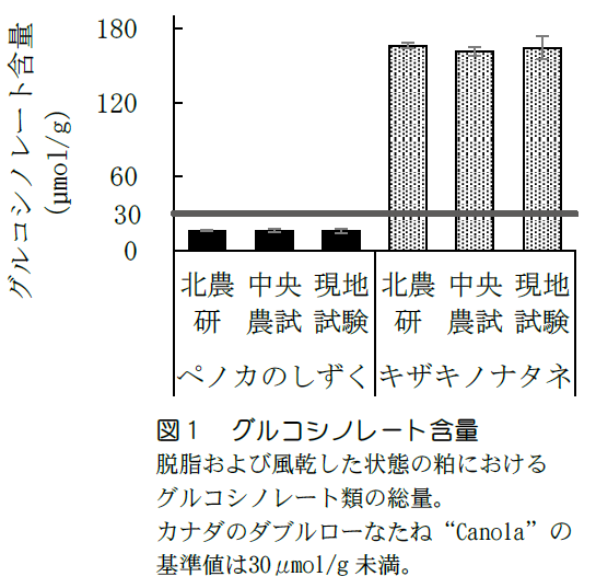 北海道の主力品種である「キザキノナタネ」は収量性や含油率が高く、低エルシン酸(シングルロー)品種である。一方で、キャノーラ油あるいはサラダ油の原料等として輸入されている海外産品種は、低エルシン酸に加えてグルコシノレート含量が低い、いわゆるダブルローの特性を有する。ダブルローなたねの搾油粕は、家畜に有害なグルコシノレート含量が低く、タンパク質飼料としても利用価値が高い。「キザキノナタネ」の搾油粕は、グルコシノレート含量が高いため家畜飼料としての利用が難しく、飼料に比べて需要が少ない有機質肥料としての利用に限られている。また、近年は輸入大豆粕等の飼料原料価格の高騰が深刻化し、搾油粕を自給タンパク質飼料として利用できるダブルロー品種栽培へのニーズが高まっている。