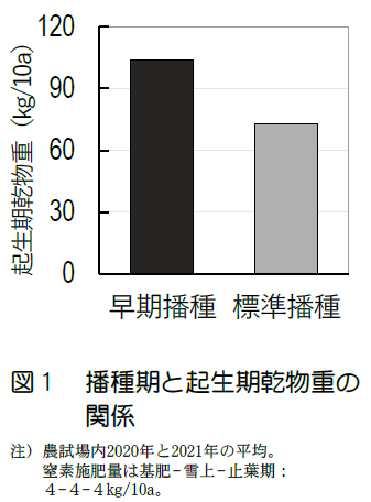 2)播種時期については、早期播種は越冬前の生育が前進するため起生期の乾物重が多く、越冬性に優れていた(図1)。しかし、早期播種では茎数の淘汰から穂数が不足し、標準播種よりやや低収となった(図2)。