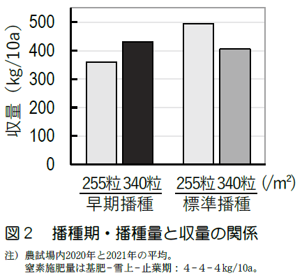 3)播種量については、340粒/m²の越冬前茎数や乾物重、窒素吸収量が255粒/m²より多かった。収量は早期播種では340粒/m²、標準播種では255粒/m²が多い傾向にあった(図2)。
