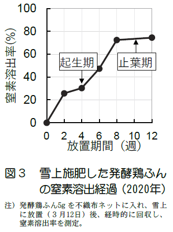 4)3月中旬に雪上施肥した発酵鶏ふんの窒素は止葉期までに75%溶出し(図3)、生育・収量を改善した(図4)。
