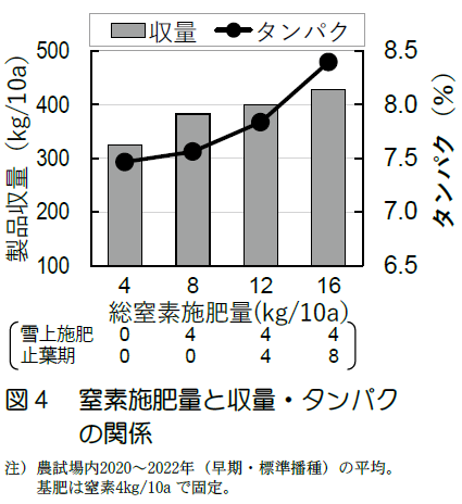 5)止葉期の追肥量が増えるにつれ、収量、タンパクが増加する傾向にあった(図4)。