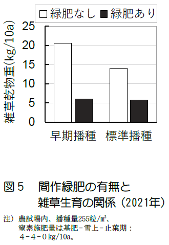 7)成熟期の雑草生育量は熱水抽出性窒素が高い現地や止葉期追肥量が多い試験区で多かった。主な草種は、スズメノカタビラ、ハコベ、ナズナであった。間作緑肥により雑草量が大幅に抑制された(図5)。