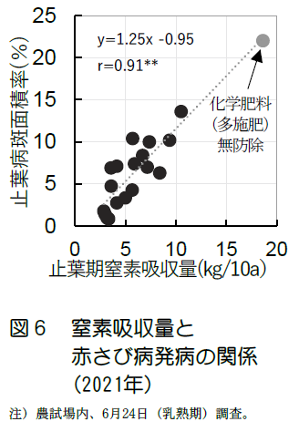 8)早期播種では雪腐病発病度が高かったが、越冬後の作物体残存量は多かった(図1)。赤さび病の病斑面積率は止葉期の窒素吸収量に比例して高く(図6)、止葉期追肥により高まった。開花期の少雨により赤かび病は3年とも少発生で、処理間差はなかった。