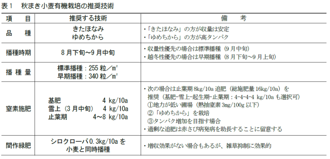 9)以上より、秋まき小麦有機栽培で収量性優先の場合は9月中旬に255粒/m²播種し、越冬性優先の場合は8月下旬~9月上旬に340粒/m²播種するのが最適である。窒素施肥量は基肥-雪上(3月中旬)-止葉期:4-4-4~8kg/10aを目安とする(表1)。