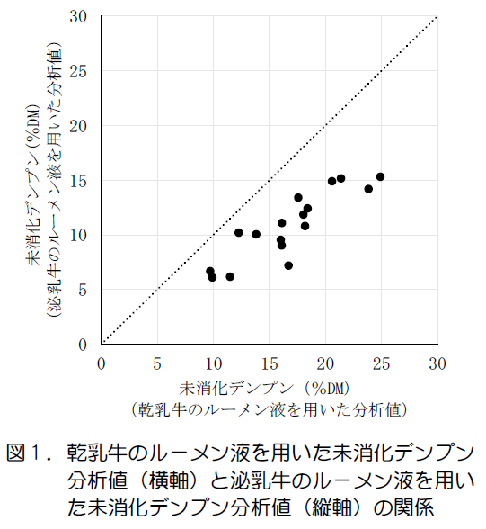未消化デンプン(泌乳牛)= e{0.9936×log(未消化デンプン(乾乳牛))-0.4344}が得られた。
