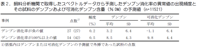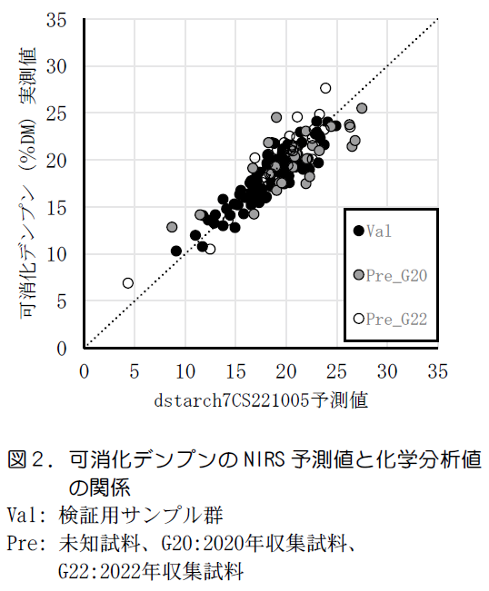 2)検量線作成用サンプル可消化デンプン測定値は、平均17.0±5.1、最小5.7、最大31.6であった。作成したNIRS検量線の検証用サンプル群でのEI値による精度判定は「B(高い)」であった(表1)。Biasは0.38(予測値はやや過大評価となる傾向)であったが、その値はSEPよりも小さく、NIRS検量線の予測誤差の範囲であった(表1、図2)。未知試料のみでの検証でも、EI値による精度判定は「B(高い)」であった(表1)。以上より、作成したNIRS検量線は実用可能な精度であると考えられた。本試験で作成した検量線の適用対象外とする基準として、デンプン消化率の値が負となった試料、デンプン消化率が100%を超える試料およびデンプンまたは可消化デンプンの予測値が外挿となる試料(デンプン(%DM):11.6~43.4、可消化デンプン(%DM):5.7~31.6から外れる)を暫定的に定めた。分析機関における出現頻度はそれぞれ0.2%、0.5%、および1.7%であった(表2)。