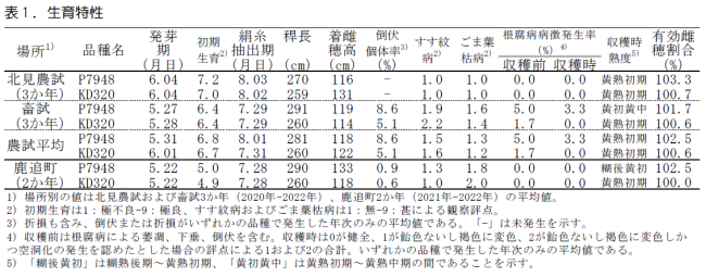 とうもろこし(サイレージ用)「P7948」は、パイオニア社(アメリカ)が単交配(フリントデント×デント)により育成した一代雑種品種である。ホクレン農業協同組合連合会が2019年に導入し、品種比較予備検定試験を行った。有望性が認められたことから2020年-2022年に北見農業試験場(訓子府町)および畜産試験場(新得町)において品種比較試験を行った。また、2021年-2022年に鹿追町において、同現地試験を行った。さらに、2020年-2022年に北海道農業研究センター(札幌市)において、すす紋病抵抗性およびごま葉枯病抵抗性に関する特性検定試験を行った。