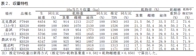 4)収量性・乾物特性:乾物総重および推定TDN収量は農試平均で並およびやや多く、現地でともに多い(表2)。乾雌穂重割合は高く、乾物中推定TDN割合はやや高い(表2)。