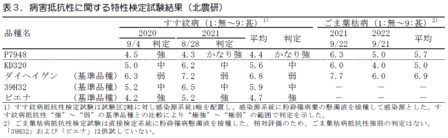 6)耐病性:特性検定試験におけるすす紋病抵抗性は“かなり強”である(表3)。軽微な発生条件下での圃場試験におけるすす紋病罹病程度は同程度であった(表1)。特性検定試験におけるごま葉枯病抵抗性はやや弱い(表3)。圃場試験におけるごま葉枯病罹病程度は同程度であった(表1)。根腐病の発生率は同程度からやや高い(表1)。